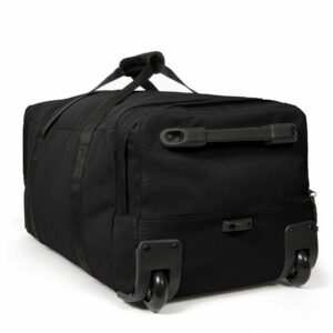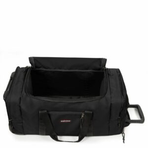 Weekendtas met wielen van het merk EASTPAK, grote reistas met een ruime ingang doormiddel van een u vormige rits, twee grote bijna geluidloze soepel rollende wieltjes, heeft twee korte handvatten een een handgrip bovenop, twee zijvakken, binnenin en aan de voorkant een kleine rits en gemaakt van 100% polyester.